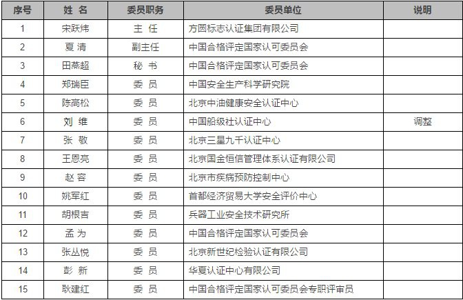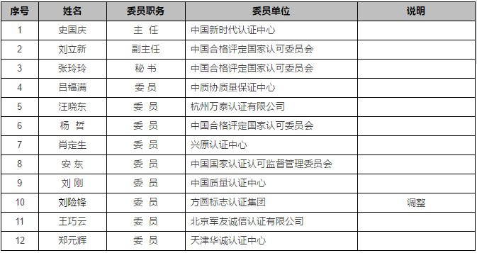 三、調(diào)整方圓標(biāo)志認證集團有限公司體系事業(yè)部總監(jiān)劉險鋒為CNAS認可管理專業(yè)委員會委員(原委員工作單位變動,不再擔(dān)任)。
