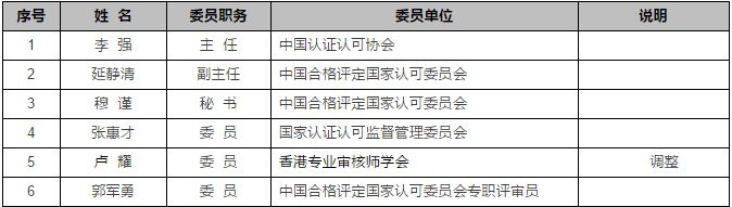 四、調(diào)整香港專業(yè)審核師學(xué)會有限公司總經(jīng)理盧耀為CNAS人員認證專業(yè)委員會委員(原委員單位由于專業(yè)性等原因,將不再為委員單位)。