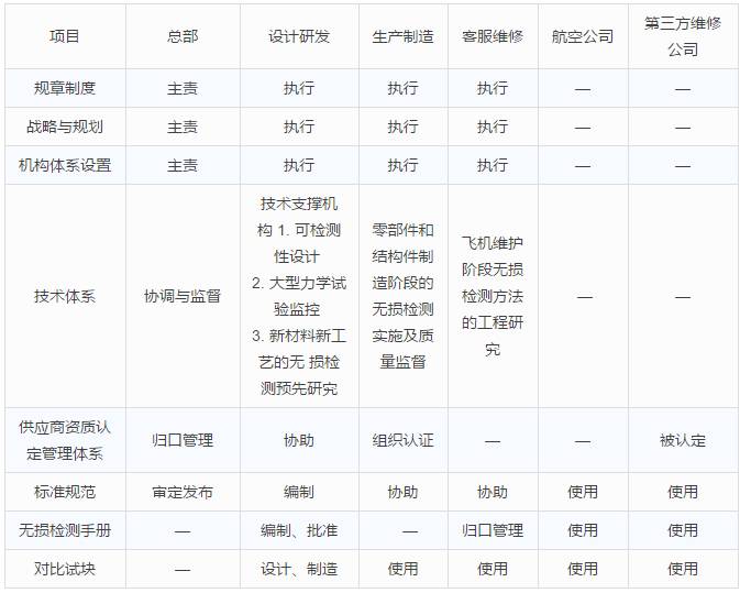 在以民機為代表的高度復(fù)雜產(chǎn)品的研制過程中,若要做到職責(zé)清晰、可操作性強,集團總部、設(shè)計研發(fā)、生產(chǎn) 制造、客服維修和航空運營等機構(gòu)和單位的無損檢測工作 需要依托職能管理,明確責(zé)任分工(見表1)。