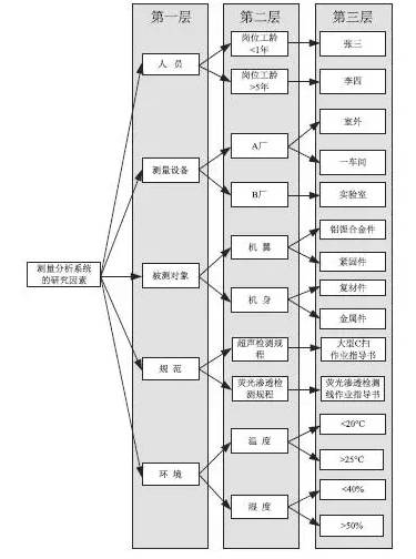 無損檢測測量系統(tǒng)分析系統(tǒng)的建立應(yīng)當(dāng)充分評估以識別所有可能影響結(jié)果的因素。如圖4所示,在民機產(chǎn)業(yè)常常采用三層樹狀圖來分析相關(guān)因素。