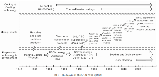 分析所獲得的核心專利數(shù)據(jù)可知,Ni基高溫合金核心技術(shù)主要涉及合金制備、合金成分、合金應(yīng)用3方面內(nèi)容。制備技術(shù)的升級促進(jìn)了產(chǎn)品的更新?lián)Q代,產(chǎn)品性能得到提升,同時(shí)氣冷、水冷以及熱障涂層技術(shù)等輔助技術(shù)的發(fā)展大幅提升了合金產(chǎn)品的耐高溫性能。其中合金制備涉及到定向凝固及單晶技術(shù)、熱障涂層、合金修復(fù)技術(shù)、熱處理技術(shù)及金屬間化合物制備等。圖1是Ni基高溫合金從1950年代至今其核心技術(shù)演進(jìn)簡圖。