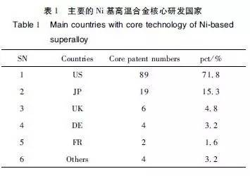 有關(guān)Ni基高溫合金的核心專利技術(shù)自出現(xiàn)以來一直在持續(xù)地發(fā)展,主要的技術(shù)擁有國美國和日本在這一技術(shù)領(lǐng)域的研發(fā)活動(dòng)和產(chǎn)出也比較多,另外德國、英國、法國等國家也是主要的核心技術(shù)擁有者(見表1)。