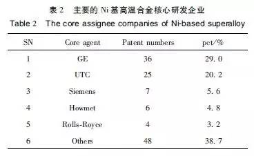 美國通用電氣公司(GE)和聯(lián)合技術(shù)公司(UTC)是其中的主要核心專利權(quán)人,其擁有的核心技術(shù)專利占到整個(gè)核心專利的近一半,另外德國西門子(Siemens)、美國豪梅公司(Howmet)、英國羅-羅公司(Rolls-Rayce)、日本產(chǎn)業(yè)技術(shù)研究所、美國克珞美瑞燃?xì)鉁u輪有限公司、特殊金屬公司等也具有相當(dāng)?shù)募夹g(shù)實(shí)力(見表2)。