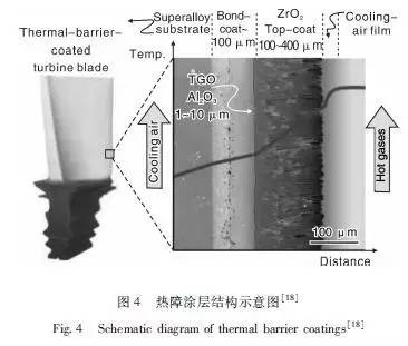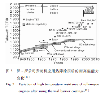 熱障涂層技術(shù)是美國NASA中心提出的,將耐高溫、高隔熱的陶瓷材料涂覆在合金基體表面,作用是降低合金表面溫度,可以讓合金在更高溫度下工作。英國羅羅公司為了提升發(fā)動(dòng)機(jī)的耐高溫能力,早在1960年開始試驗(yàn)隊(duì)發(fā)動(dòng)機(jī)進(jìn)行冷卻的技術(shù),使得發(fā)動(dòng)機(jī)的抗高溫能力大幅提升;20世紀(jì)90年代開始出了冷卻技術(shù)外,又研發(fā)出了熱障涂層技術(shù),發(fā)動(dòng)機(jī)的抗高溫性能進(jìn)一步提升(圖3)。一般情況下,熱障涂層在100~500微米厚,可以降低合金表面溫度100℃~300℃甚至更高,第4代Ni基高溫合金本身大約可以耐高溫1180℃,但在熱障涂層存在下可以使渦輪發(fā)動(dòng)機(jī)在1300℃以上環(huán)境中工作,從而大大提高發(fā)動(dòng)機(jī)的效率和性能。