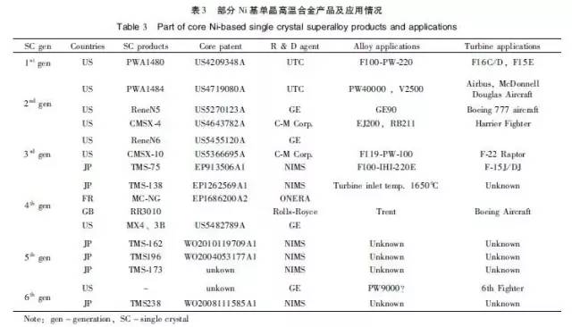 Ni基高溫合金核心專利產(chǎn)品包含采用熔煉、鑄造和單晶等技術(shù)生產(chǎn)的產(chǎn)品,其中單晶產(chǎn)品代級間在耐高溫性能上高出30~60℃。第2代產(chǎn)品開始含有一定比例的Re;第4代產(chǎn)品含有一定比例的Ru;第5代產(chǎn)品通過添加Si改善合金的抗氧化性能,同時(shí)增加了Ru的含量,Ta被置換出來維持γ/γ微觀結(jié)構(gòu);第6代產(chǎn)品處Ru,Re的其他Pt族金屬的地位得到提升。據(jù)報(bào)道,已經(jīng)研發(fā)第6代Ni基單晶高溫合金技術(shù)的主要是日本NIMS和美國GE。日本NIMS重視材料的綜合性能、環(huán)保性能,Ru的含量達(dá)到5.0%,其中高溫環(huán)境下的抗氧化性相對更重視,報(bào)道的合金產(chǎn)品型號為TMS-238。美國GE提升了其他Pt族金屬在合金中的含量,據(jù)報(bào)道含量從0.1%~6.0%,具體產(chǎn)品名稱未見報(bào)道。表3列出了部分Ni基單晶高溫合金及其應(yīng)用情況。