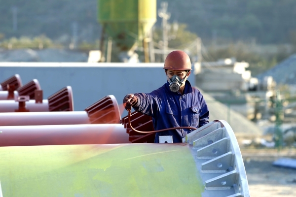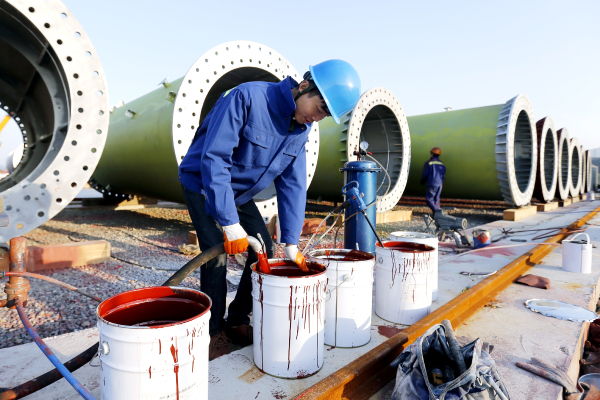 在舟山500千伏聯(lián)網(wǎng)工程現(xiàn)場,十余名工作人員正在為地面堆放整齊的一根根鐵塔桿管噴刷“石墨烯改性重防腐涂料”,為這座在建的世界最高鐵塔穿上一身“防腐外套”。
