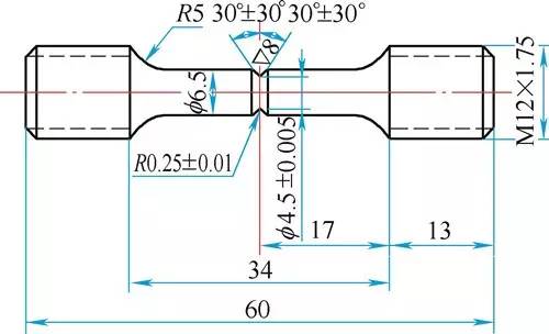 3、試樣的制造。按圖沿材料的順纖維方向加工試樣,粗加工后熱處理至所要求的抗拉強(qiáng)度,然后精加工至規(guī)定尺寸,缺口用中軟細(xì)粒氧化鋁砂輪磨制。磨削時(shí)應(yīng)保證缺口根部半徑圓滑。磨削后投影檢查,確保缺口尺寸符合圖紙要求。逐根測量缺口根部直徑(圖中為φ4.5±0.05mm)的尺寸,并做好編號記錄。