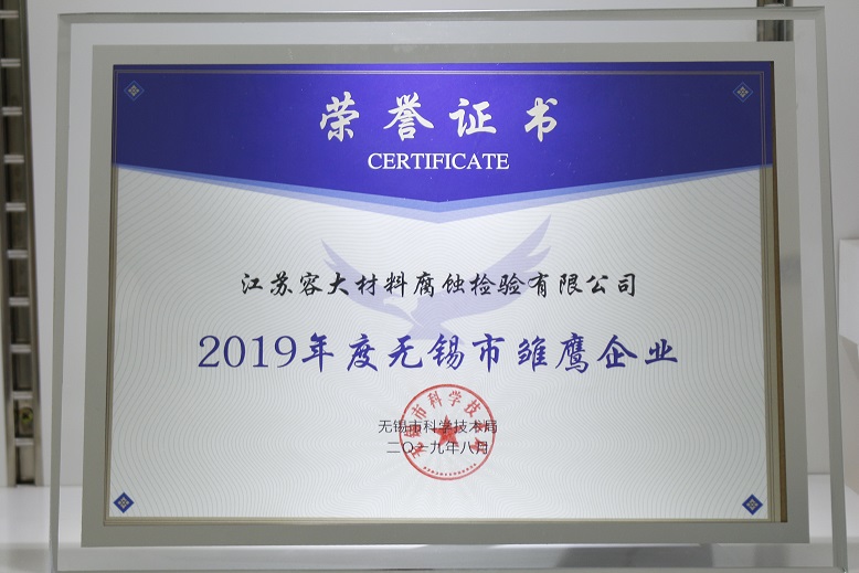 典禮上,江蘇容大材料腐蝕檢驗有限公司獲得了由無錫市科技局頒發(fā)的2019年度無錫市雛鷹企業(yè)榮譽證書。